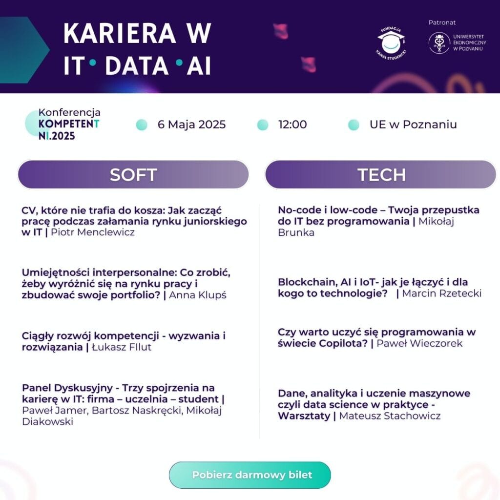 Już 6 maja o 12:00 na Uniwersytecie Ekonomicznym w Poznaniu odbędzie się organizowana przez Fundację Kanał Studencki konferencja poświęcona karierze w IT, Data i AI.